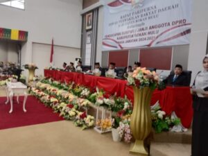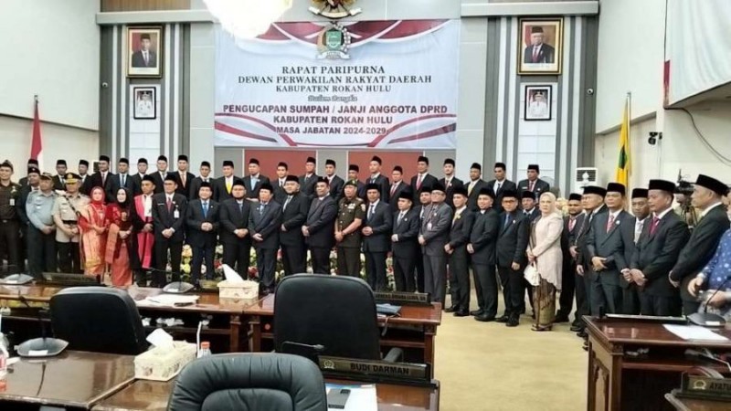 ROHUL, RIAUTERBARU. com – Sebanyak 45 anggota Dewan Perwakilan Rakyat Daerah (DPRD) Kabupaten Rokan Hulu masa bakti 2024-2029 resmi dilantik dan diambil sumpahnya. Pelantikan ini dilakukan dalam rapat paripurna DPRD yang digelar di Gedung DPRD Rokan Hulu, yang dipimpin langsung oleh Ketua DPRD Kabupaten Rokan Hulu, Novliwanda Ade Putra, S.T.,M.Si. Senin (02/09/2024).