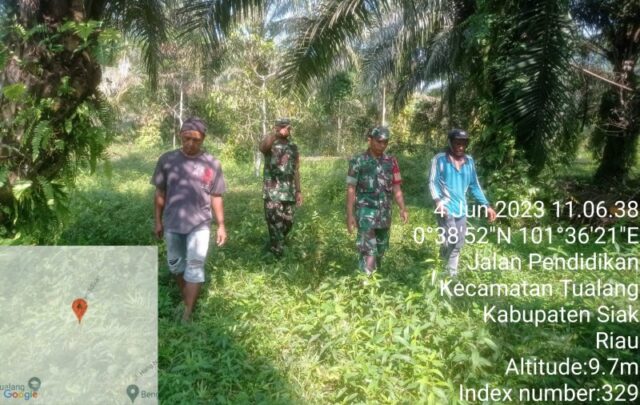 SIAK, RIAUTERBARU.com– Dalam upaya mengantisipasi terjadinya Kebakaran Hutan dan Lahan (Karhutla), anggota Koramil 04/Perawang Sertu Sarju dan Kopda L.Sigalingging  patroli karhutla bersama masyarakat di RT/RW 02/03 Kampung Tualang Kecamatan Tualang, Kabupaten Siak, menelusuri areal perkebunan melaksanakan patroli di titik-titik rawan Karhutla untuk menjaga lingkungan, Minggu (04/6/2023)