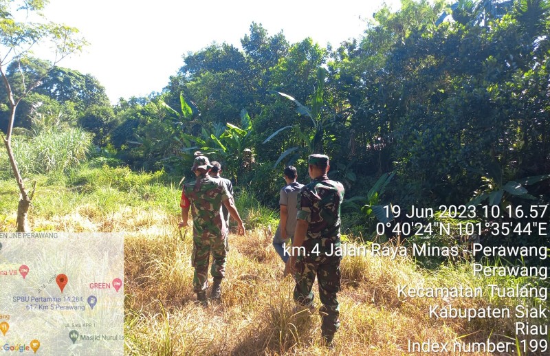 SIAK, RIAUTERBARU.com– Dalam upaya mengantisipasi terjadinya Kebakaran Hutan dan Lahan (Karhutla), anggota Koramil 04/Perawang Sertu Sarju dan Kopda Suratno Melaksanakan Patroli Karhutla di RT/RW 06/03 Kelurahan Perawang, Kecamatan Tualang, Kabupaten Siak, menelusuri areal perkebunan melaksanakan patroli di titik-titik rawan Karhutla untuk menjaga lingkungan, Senin (19/6/2023)