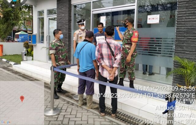 SIAK, RIAUTERBARU.com – Koramil 04p/Perawang Jajaran Kodim 0322/Siak Pelda Ramli Nasution dan Koptu Togi Sitorus melaksanakan tugas patroli pengawasan maupun penegakan disiplin protokol kesehatan 5M upaya mencegah penyebaran Virus Covid-19 bertempat di Kantor Bank BRI dan Pasar M.Ali, Kecamatan Tualang, Kabupaten Siak, Selasa (14/3/2023).