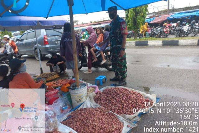 SIAK, RIAUTERBARU.com – Koramil 04/Perawang Jajaran Kodim 0322/Siak Sertu Sarju melaksanakan tugas patroli pengawasan maupun penegakan disiplin protokol kesehatan 5M upaya mencegah penyebaran Virus Covid-19 bertempat di Pasar Tuah Srumpun dan Jalan Raya Perawang Km 4, Kecamatan Tualang, Kabupaten Siak, Selasa (17/4/2023).