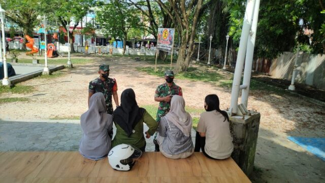 SIAK, RIAUTERBARU.com – Koramil 04/Perawang Jajaran Kodim 0322/Siak Kopda Lasroha.S dan Kopda Suratno melaksanakan tugas patroli pengawasan maupun penegakan disiplin protokol kesehatan 5M upaya mencegah penyebaran Virus Covid-19 bertempat di Taman Motuyoko Perawang, Kecamatan Tualang, Kabupaten Siak, Sabtu (13/5/2023).