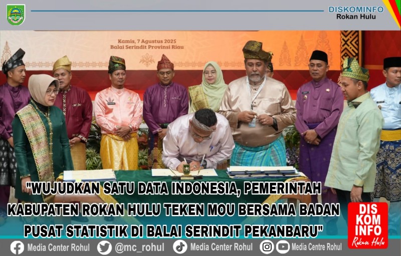 PEKANBARU, RIAUTERBARU. com – Dalam rangka mewujudkan program Satu Data Indonesia, Pemerintah Kabupaten Rokan Hulu (Pemkab Rohul) bersama Badan Pusat Statistik (BPS) Rokan Hulu menandatangani Kesepakatan Bersama (MoU) di Balai Serindit, Komplek Gubernuran Riau, Pekanbaru, Kamis (7 Agustus 2025).